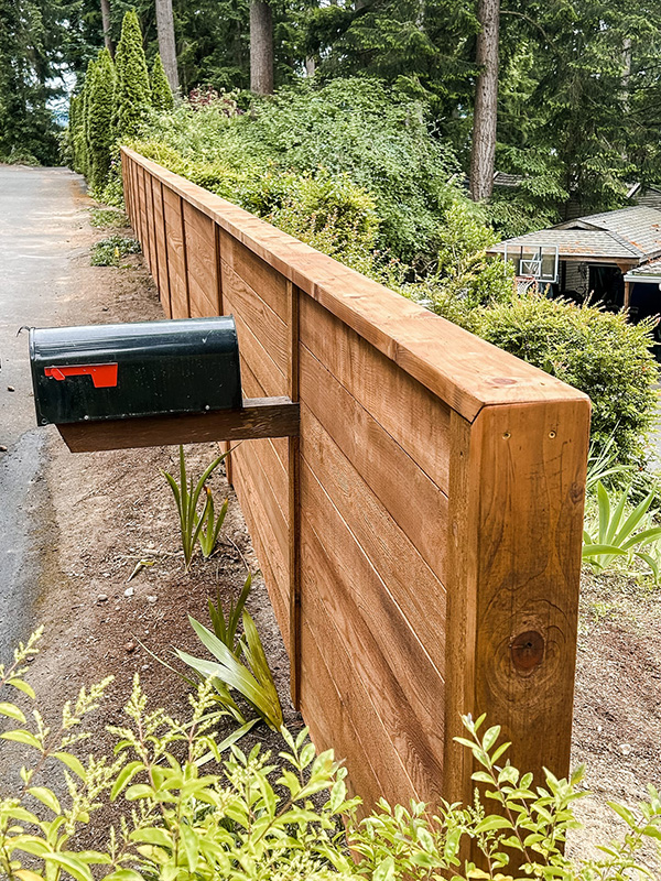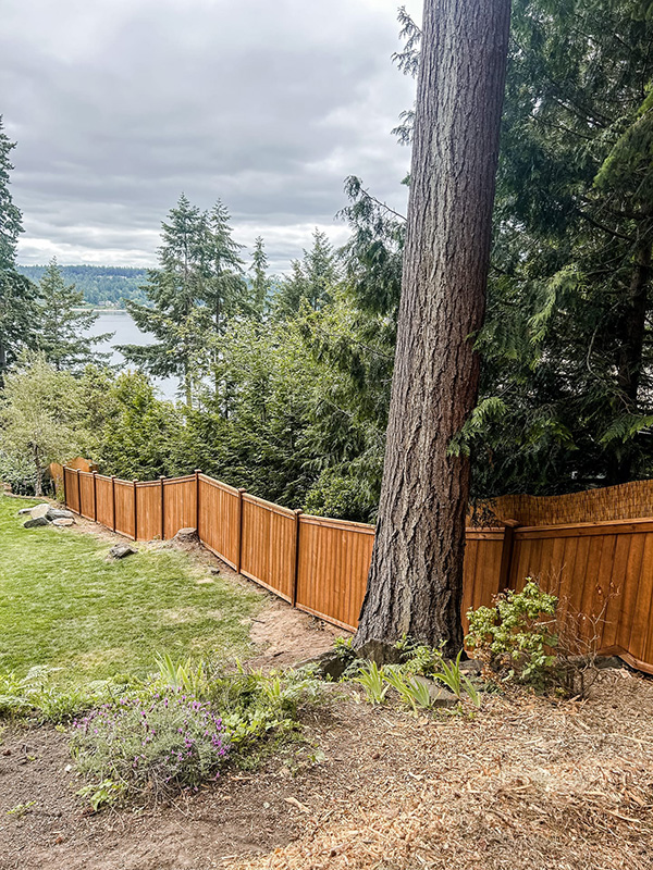 4' horizontal cedar fence in Gig Harbor with clear cedar fence boards, premium 2x6 top cap, and stained with a semi-transparent oil based stain.