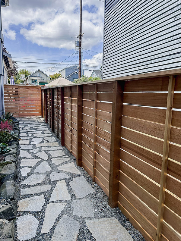 This was a fence replacement from chain-link to our 6' horizontal style cedar fence. Job was located in Tacoma. Pressure treated jumbo 4x4 posts, clear cedar fence boards, and premium 2x6 top cap.